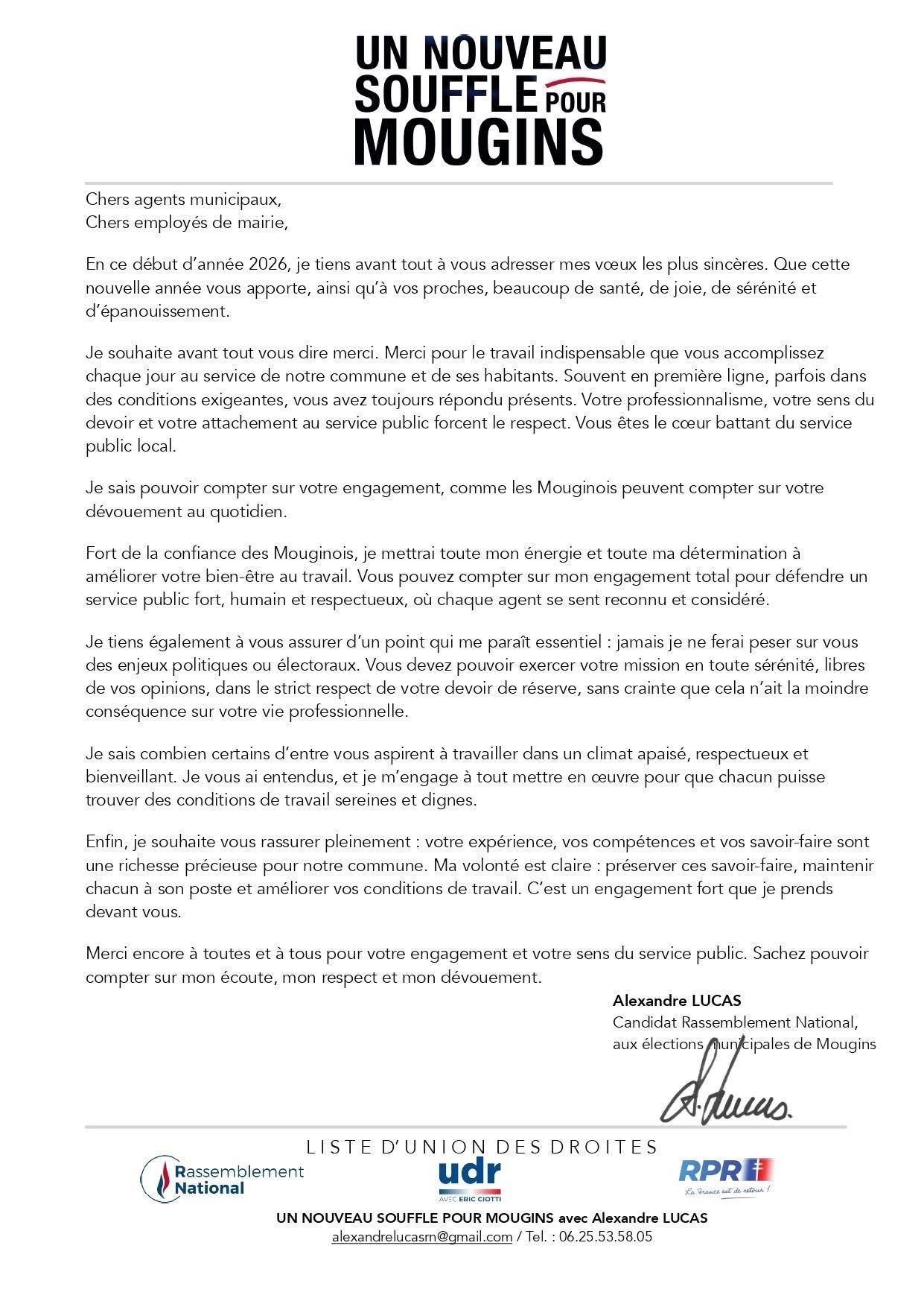 Ce courrier exprime sa considération pour leur engagement quotidien au service des Mouginois, ainsi que sa volonté d’instaurer un climat fondé sur l’écoute, la confiance et le respect mutuel.